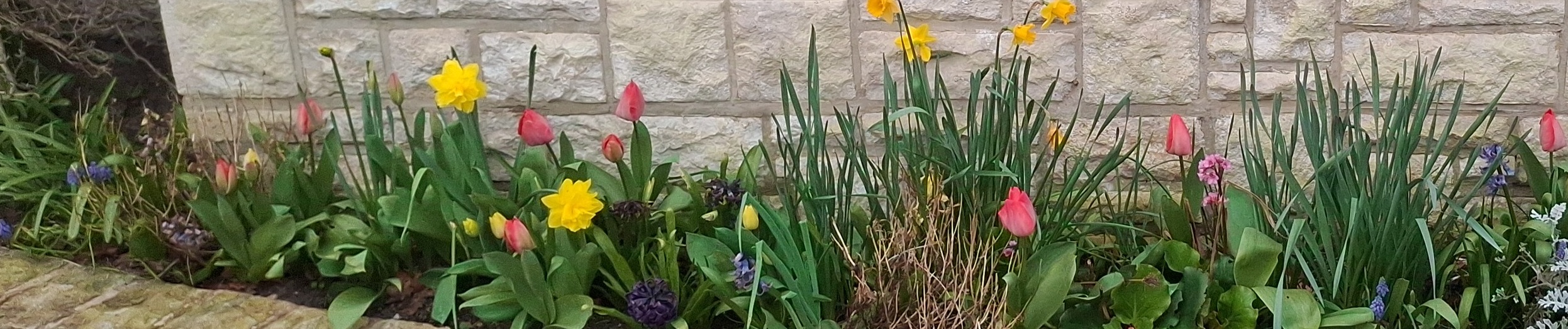 I just love this time of year. The Sun is shining, the flowers are blooming, the bees are buzzing, and the birds are singing. I think they’re happy. Like the children we hear at playtime in the nearby school. Like the robin that fluttered around me as I weeded the front border on my hands and knees.