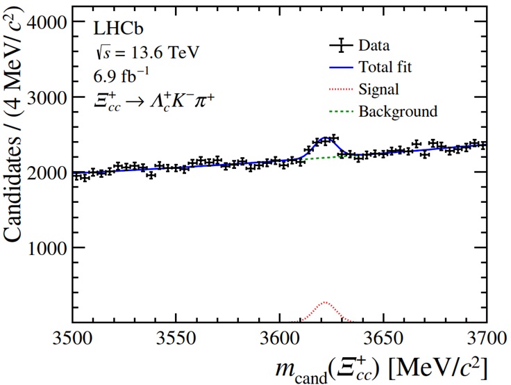 They’ve been pulling this stunt for more than forty years. See the January 2003 physicsworld article Carlo Rubbia and the discovery of the W and Z by Gary Taubes. They “discovered” the W-boson in 1983 by detecting an electron. What did they detect this time? A bunch of known particles. Take a look at the CERN news article. The title is “Observation of the doubly charmed heavy proton Ξcc⁺” but that’s not what they observed. They observed decay products. It’s like saying you observed the Loch Ness monster because you found a bone on the beach. It really is. The CERN news article says the Xi-cc-plus “was spotted through its decay into three lighter particles”. The Xi-cc-plus baryon allegedly has a lifetime of less than 3 x 10⁻¹⁴ seconds. It allegedly decays into a Lambda-c-plus baryon Λc⁺, a negative kaon K⁻, and a positive pion π⁺. The Lambda-c-plus baryon allegedly has a lifetime of circa 2 x 10⁻¹³ seconds. It allegedly decays via an 80 GeV W-boson, which allegedly has a lifetime of 3 x 10⁻²⁵ seconds, into a positive proton p⁺, a negative kaon K⁻, and a positive pion π⁺. The negative kaon has a lifetime of circa 10⁻⁸ seconds, as does the positive pion, whereafter you’re left with electrons, neutrinos, and photons. At no point did anybody actually observe a Xi-cc-plus baryon. They didn’t even see a quark or a gluon. Because it’s all ephemera. And as per the fabulous Higgs boson, the “evidence” for the Xi-cc-plus is just a bump on a graph: