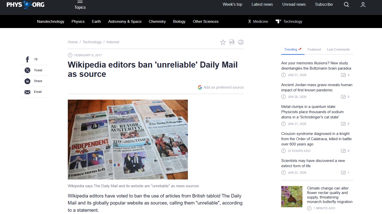 I think this comes across as rather churlish from Wikipedia. PhysOrg is a news aggregator website, and it’s free. It isn’t a research lab, and it isn’t the New York Times. Along with the super-brief Wikipedia page, this churlishness makes me think Wikipedia are dissing the competition. Check out the Wikipedia PhysOrg talk page for some pretty unpleasant stuff, such as “right wing pseudoscience” and “woo-pushing puffpiece”. It looks like the Wikipedia editors are playing thought police and censoring things they don’t like. Like they censored Einstein’s variable speed of light on the Variable speed of light page, despite what I told them on the talk page. This is not just my view, and it isn’t limited to physics. Elon Musk accused Wikipedia of bias and called them Wokepedia. Even the Wikipedia co-founder Larry Sanger said Wikipedia was guilty of left wing bias. It looks like it’s true, because Wikipedia banned the Daily Mail. I wonder if they they didn’t like the way PhysOrg reported on that: