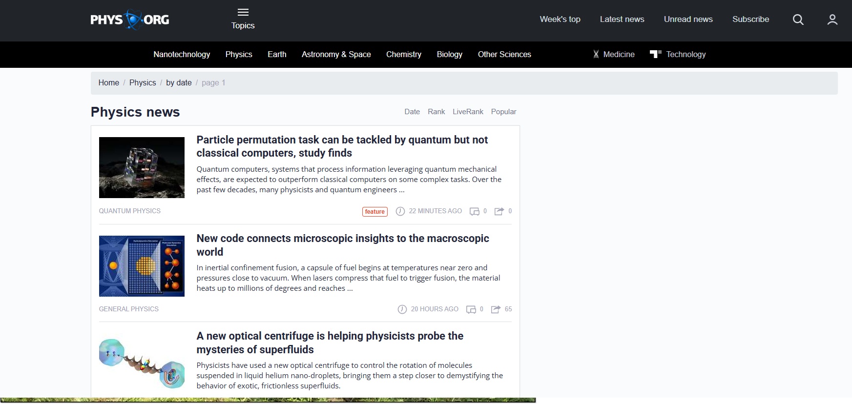 Physics news screenshot from the Phys Org website