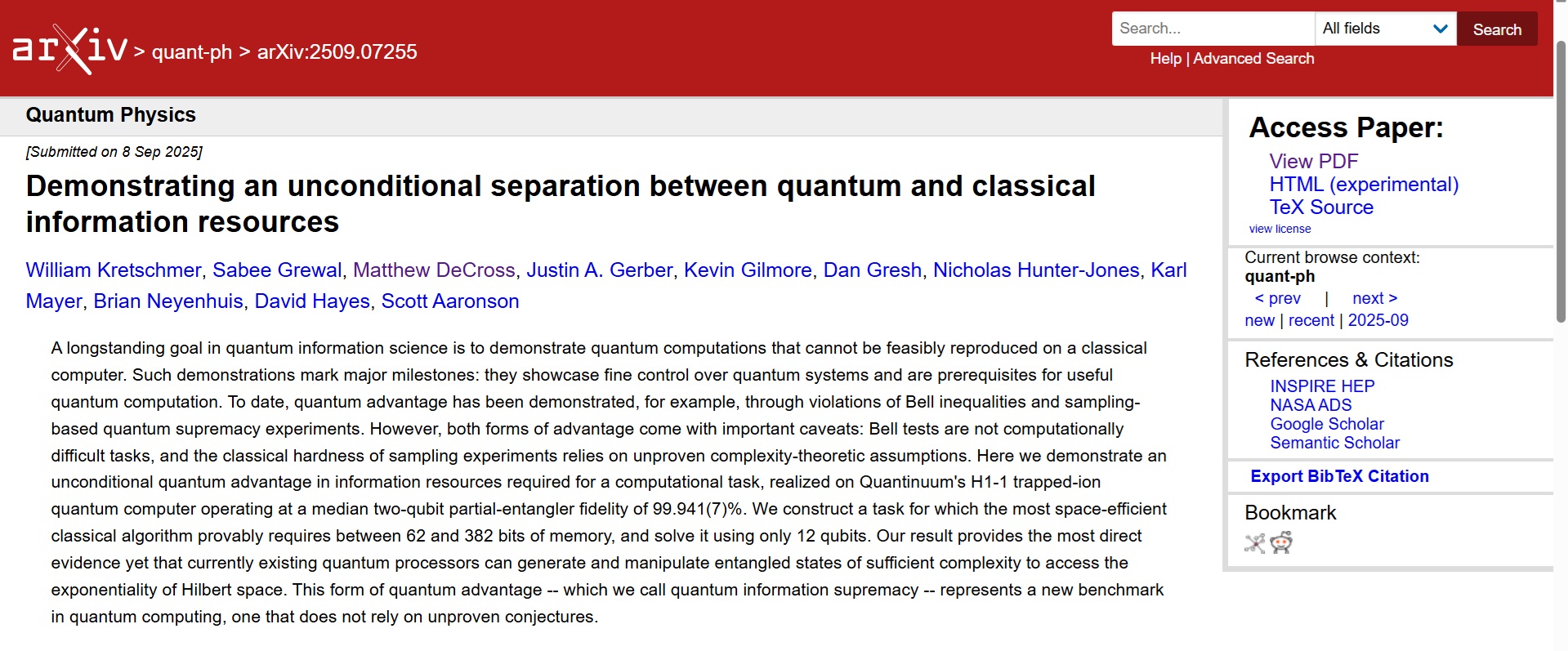 Aaronson’s Quantum Information Supremacy post is about a paper he co-wrote with ten other authors. It’s called Demonstrating an unconditional separation between quantum and classical information resources. Aaronson said he was thrilled about it, and that it’s based on a collaboration between UT Austin and a corporation called Quantinuum. He thanked his Austin colleagues William Kretschmer, Nick Hunter-Jones, and Sabee Grewal, saying Kretschmer led the theory and wrote much of the code, and Hunter-Jones and Sabee Grewal made important contributions too. He also thanked the team at Quantinuum “for recognizing a unique opportunity to test and showcase their cutting-edge hardware, and collaborating with us wild-eyed theorists to make it happen”. It would seem that Aaronson and his UT colleagues did the theoretical stuff, and the Quantinuum guys did the practical stuff. Whatever, Aaronson then gave the abstract of the paper: