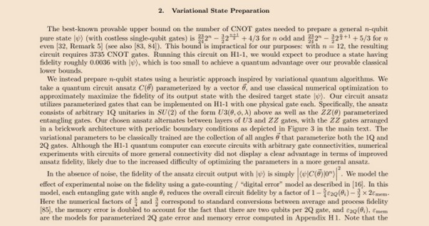 After that, the paper talked about the implementation and the results. It said they used the Quantinuum H1-1 quantum computer “which provides 20 fully connected trapped-ion qubits”. It referred to Quantum Charge Coupled Device (QCCD) architecture. This is said to be analogous to a CCD camera. The CCD camera “stores and processes imaging information as movable electrical charges in coupled pixels”. The QCCD “stores quantum information in the internal state of ions that are transported between different processing zones using dynamic electromagnetic fields”. See the Wikipedia article on trapped-ion computers for background information. Also see appendix H where you can read about Ytterbium qubit ions and Barium coolant ions, plus hyperfine states along with Bloch sphere rotations and fluorescence measurement. The moot point is that the Quantinuum H1-1 quantum computer has 20 qubits. Meanwhile there are 256 gigabytes of storage on my Samsung A35 phone. That’s over 2 trillion bits. Spot the difference.