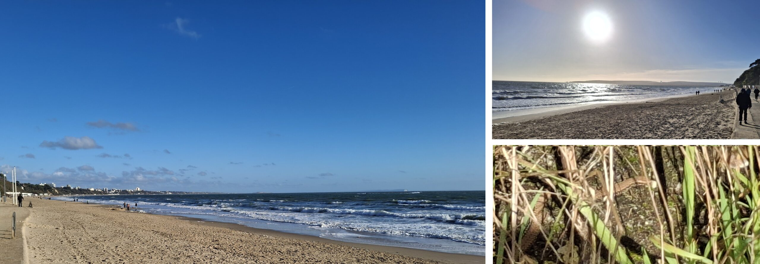 Poole, UK, December 20th 2025, clockwise: 1) looking towards Bournemouth, 2) looking towards Sandbanks, 3) a wall lizard