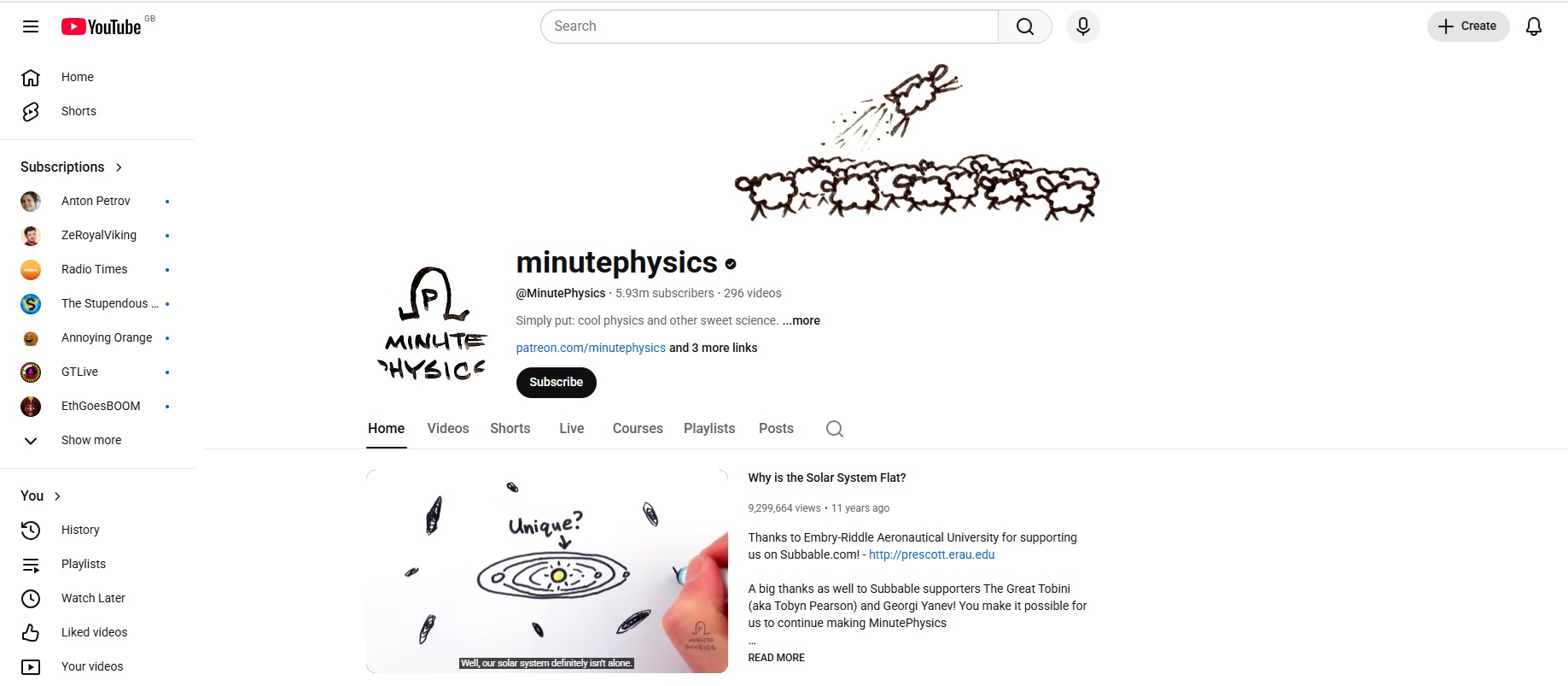 But no matter, because I for one feel upbeat about the state of physics. Like I said a couple of months ago, I feel as if I’m seeing more people taking an interest in it. I think this is particularly marked on YouTube. Check out the Feedspot web page on 90 Physics YouTubers in 2025. Top of the list is Henry Reich’s MinutePhysics YouTube channel, with 5.9 million subscribers.