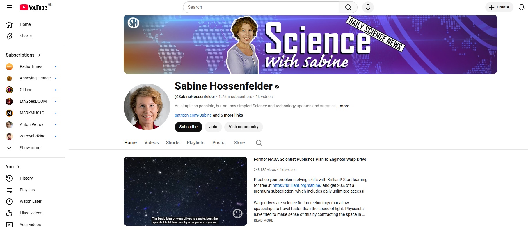 The fourth YouTube channel in the Feedspot list is Karoly Zsolnai’s Two Minute Papers physics channel, which has 1.75m subscribers. See The Biggest Physics Breakthrough Nobody Noticed, which is about vorticity. A lot of the videos on his channel are about AI as opposed to physics, so I won’t dwell on it. For some reason Sabine Hossenfelder’s YouTube channel isn’t in the Feedspot list, but she too has 1.75 million subscribers. It’s headed up Science with Sabine and Daily Science News, so it isn’t limited to physics. However it’s mostly physics: