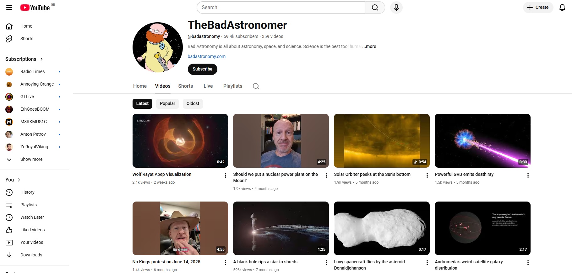 Next in Tiwari’s list is SciShow. It has 8.3 million subscribers, so it’s a big deal. However it’s more of a science channel than a physics channel. Even so, I found myself fascinated by the video on animal adoptions. For example, screech owls carry blind snakes to their nests where they eat the insects that would harm their chicks. Do they do it deliberately? We don’t know, but my guess is yes. After that came Phil Plait’s TheBadAstronomer channel. It contains too much non-astronomy stuff for my liking, which is perhaps why it’s only got 59k subscribers**. Alternatively perhaps it’s because the videos are super short and not original. See for example A black hole rips a star to shreds. I thought it was a very nice simulation lasting just over a minute, but the credit goes to DESY and the Science Communication Lab, not Phil Plait.