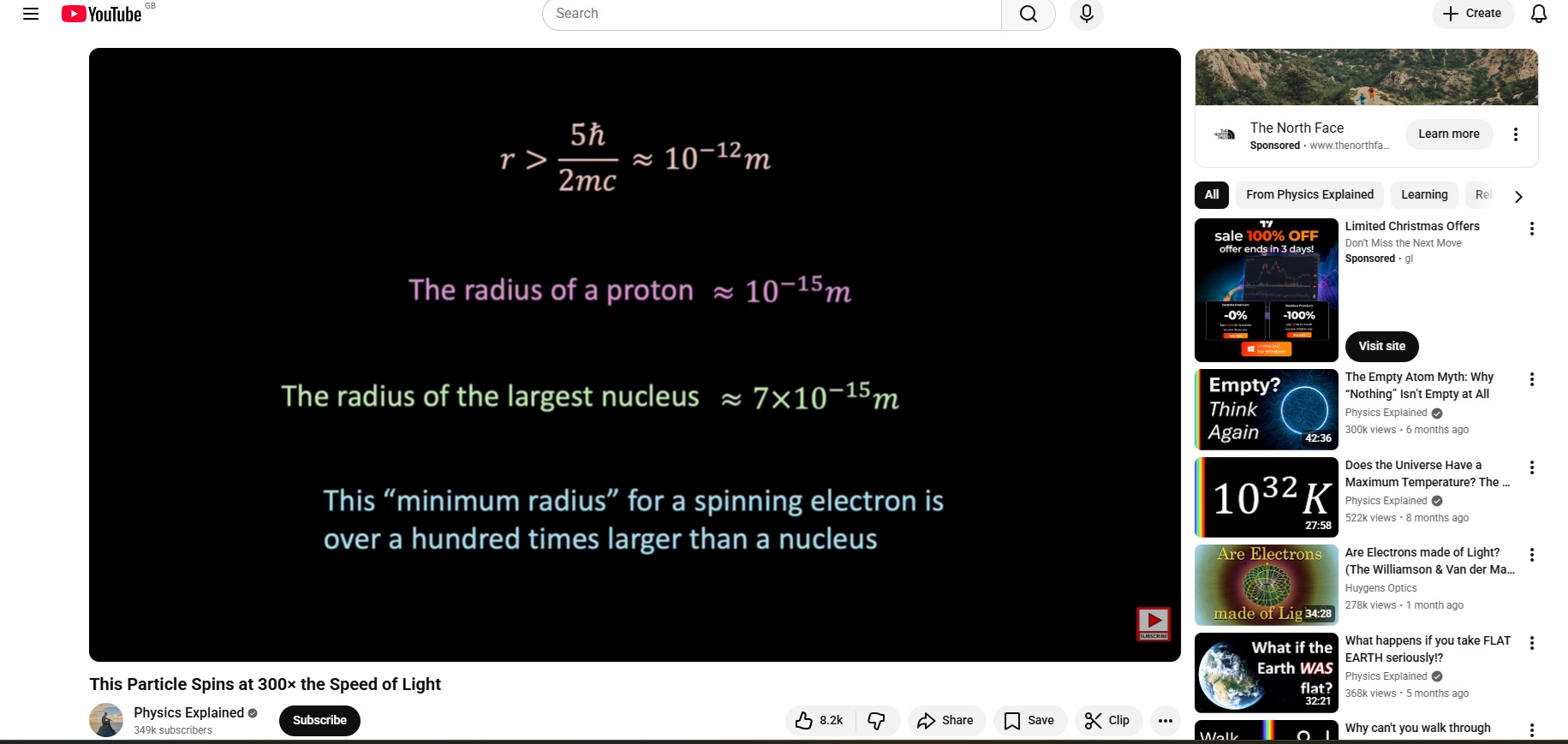 Next is Andrew Low’s Physics Explained. Videos. He’s got 349k subscribers. I took a special interest in this one because Andrew has a physics PhD, and because I started out writing articles such as Time Explained, Energy explained, Mass Explained, and so on. The idea was to explain the terms in the mathematical expressions. If you don’t know what things like t, E, and m actually denote, maybe you aren’t going to get very far. Anyway, see his 41-minute video Energy Cannot Be Created or Destroyed. But Why? The answer he gave was “because the laws of physics don’t change over time”. Maybe I’d like to talk to him about what energy is. He also said conservation of momentum is because the laws of physics don’t change across space, and that the link between symmetry and conservation marks one of the great breakthroughs in our understanding of the universe. Yes, really. Also see his 27-minute video This Particle Spins at 300× the Speed of Light. He’s talking about the electron. At 24:28 he talks about an electron size of circa 10-12 m as being “grotesquely oversized”. He also said if electrons really were this bloated, the very foundations of atomic structure would collapse.